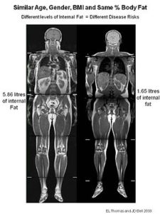 Professor Jimmy Bell, head of molecular imaging at Imperial college London, was able to show that people of similar age, gender, BMI and same Percent Body Fat had completely different body fat distribution. He used Magnetic Resonance Imaging (MRI) to come to this conclusion. The picture depicted above shows two males of similar age, BMI and same Percent Body Fat. Fat shown as bright and lean tissue as dark. One person has almost 5 times more visceral fat than the other. Scary isn’t it.